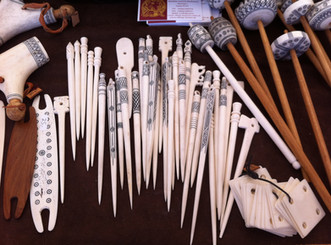 Beautiful yarn and bone knitting and weaving supplies at the Viking Moot.